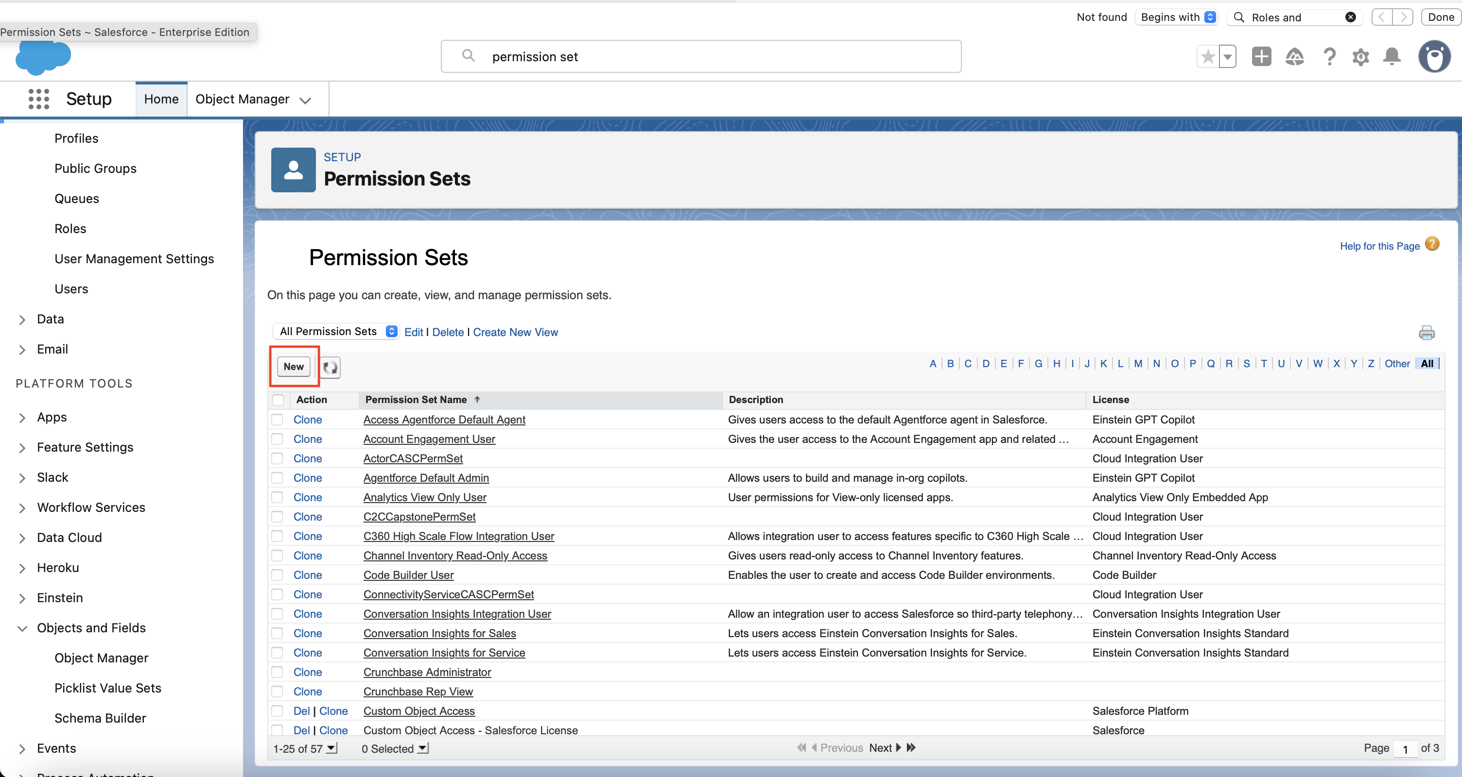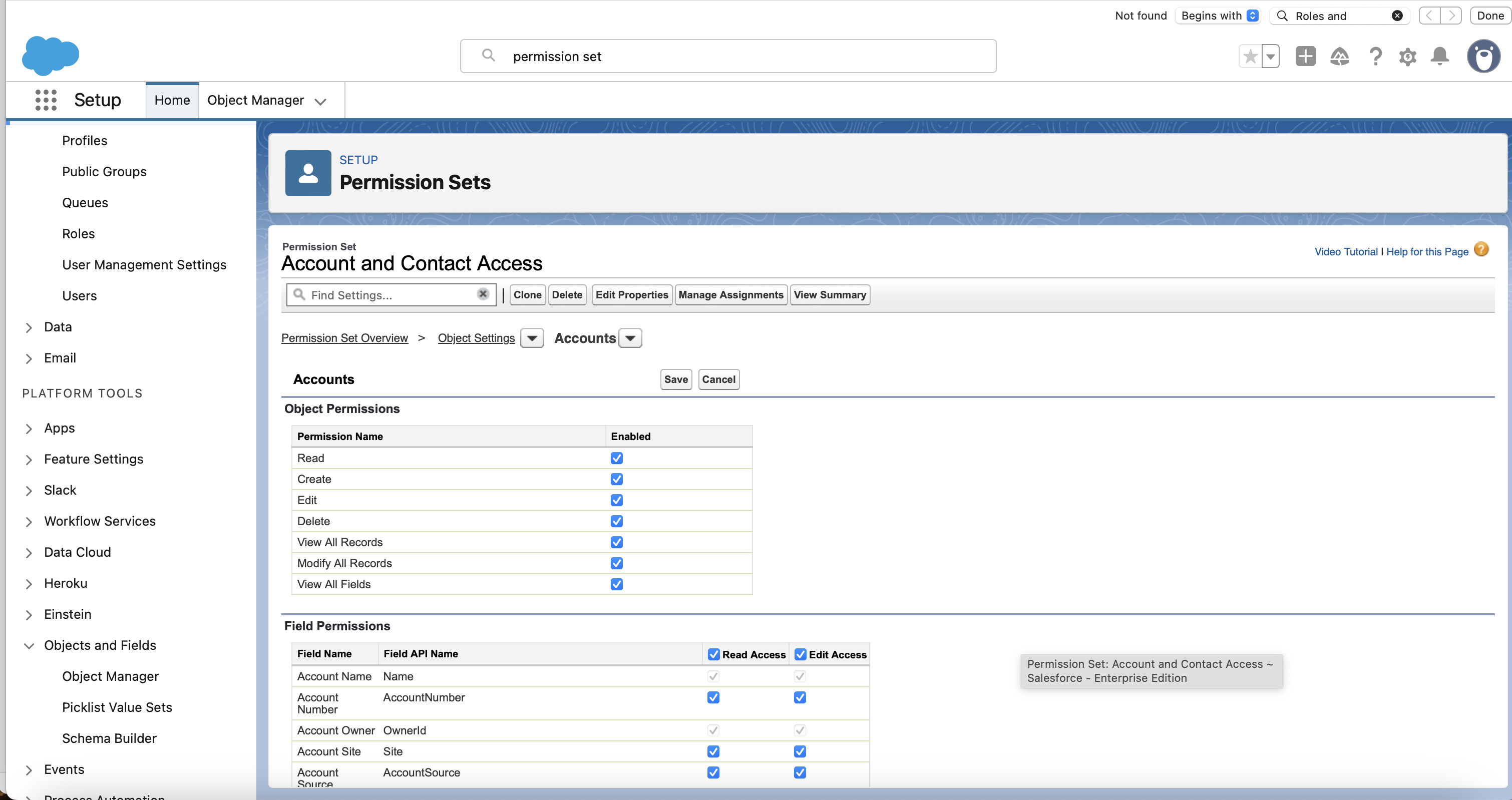 - Edit the permission so that all relevant boxes under Object Permissions and Field Permissions are checked. Then click on Save.