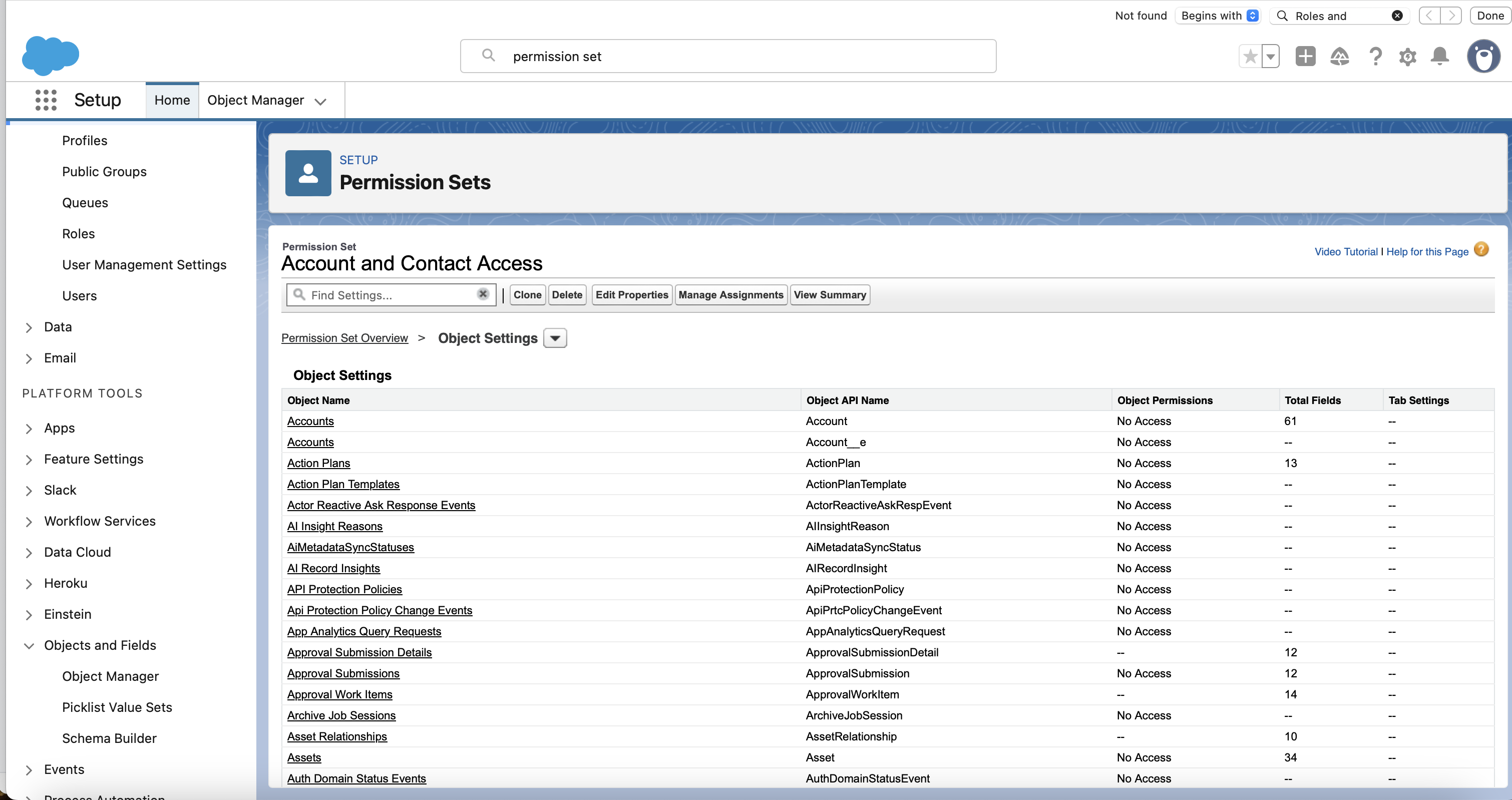 - Choose the object you need (for example, Account) and go to Object Access in the left navbar. Select the Profiles tab at the top. Click Edit and grant the necessary permissions for your custom profile.