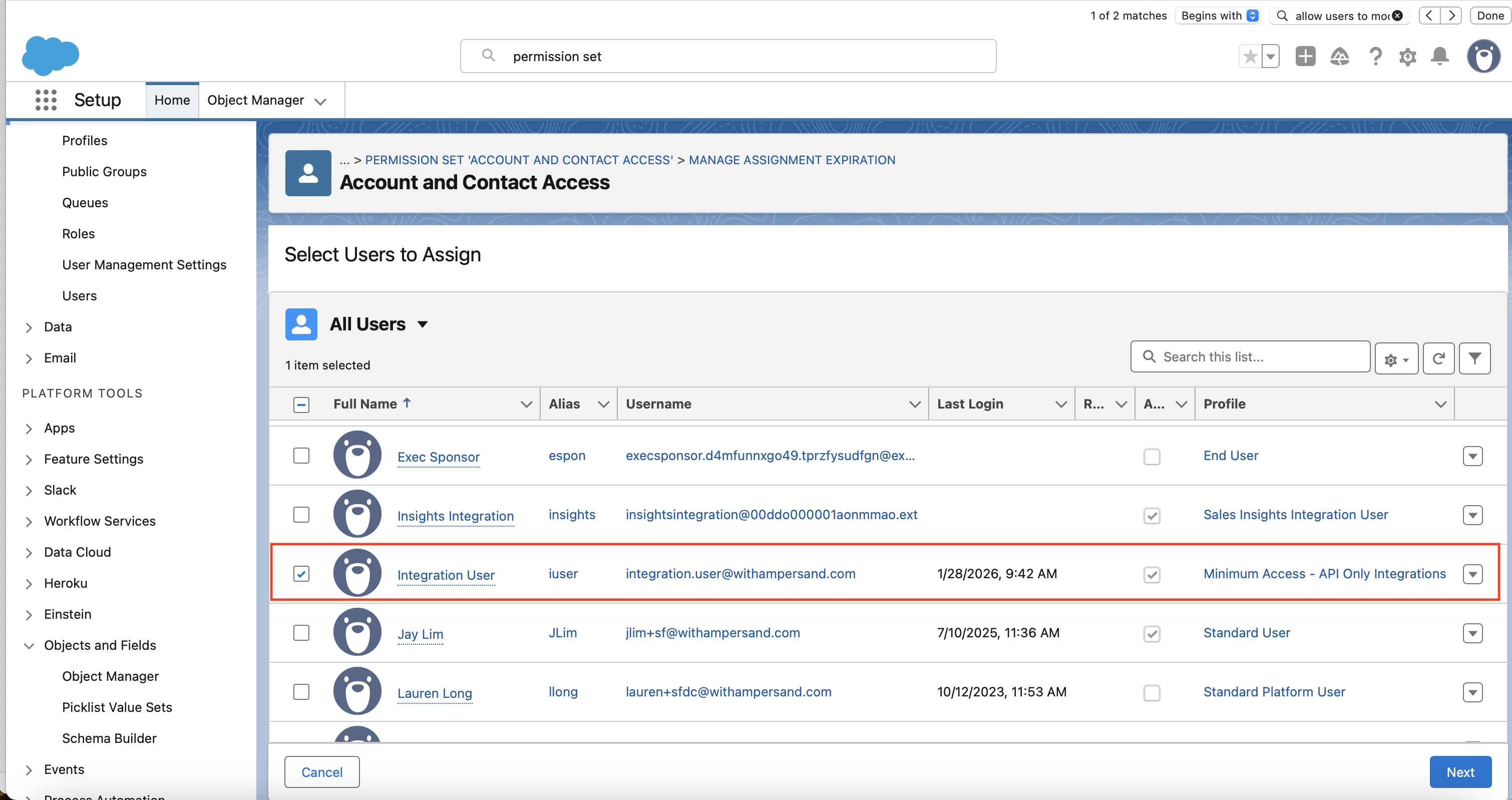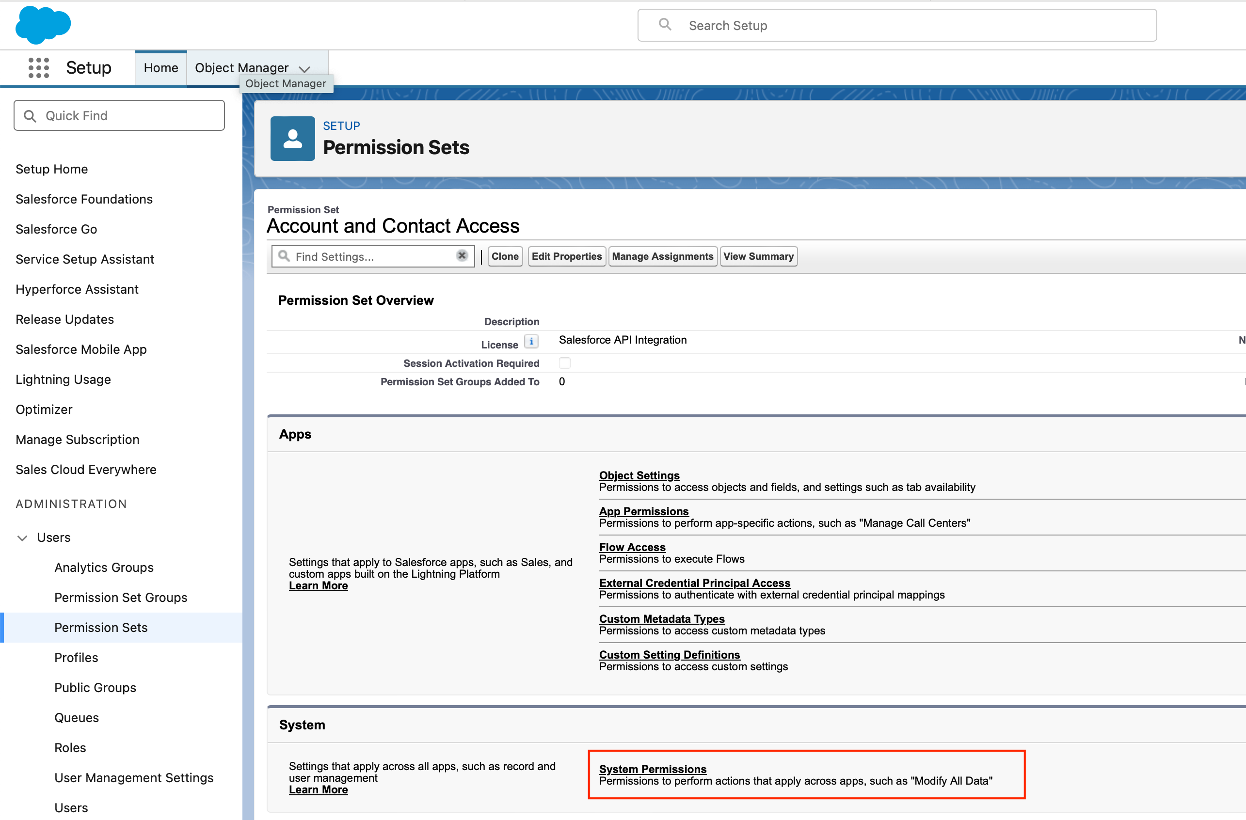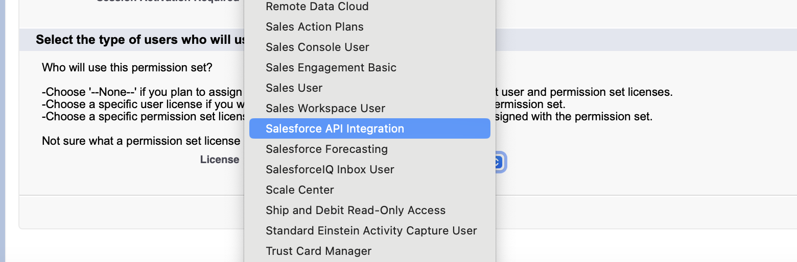 Integration User Permission Setor something that describes the level of access it has - such asAccount and Contact Access. - In the License dropdown, you must select
