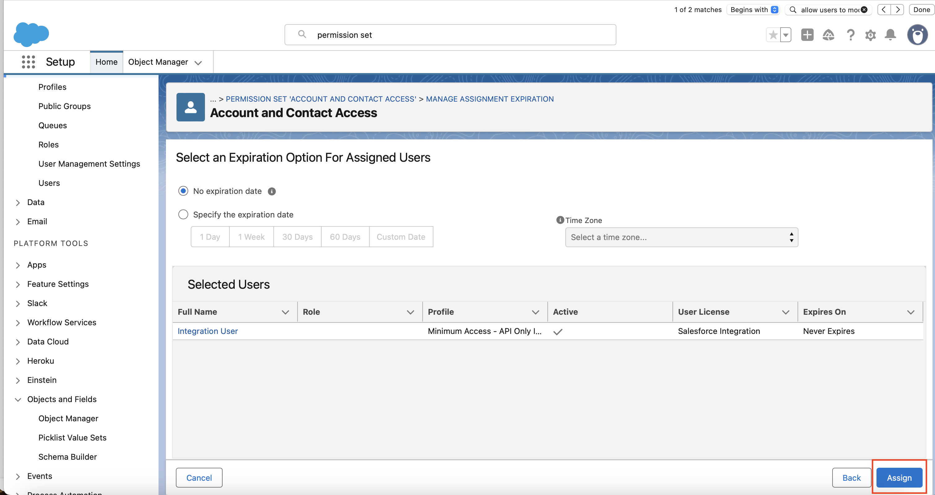 - Ensure “Expires On” is set to “Never Expires”, and then click on “Assign”.